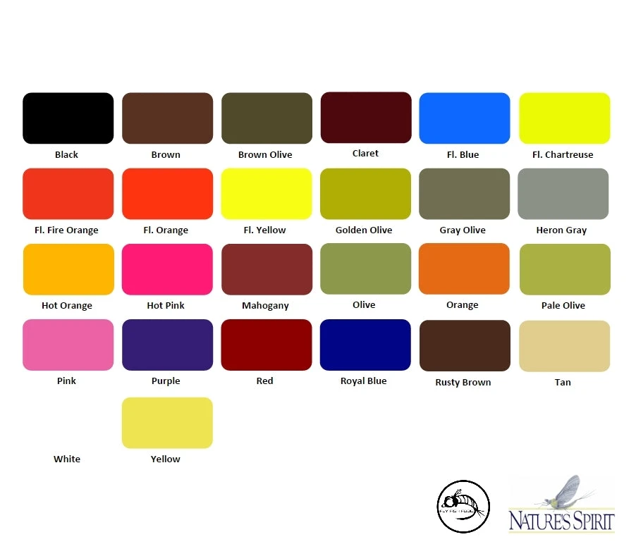 | Color | Black, Brown, Brown Olive, Claret, Crawfish Orange, Fl. Blue, Fl. Chartreuse, Fl. Green, Fl. Hot Pink, Gray Olive, Light Olive, Olive, Orange, Purple, Red, Tan, White, Yellow |