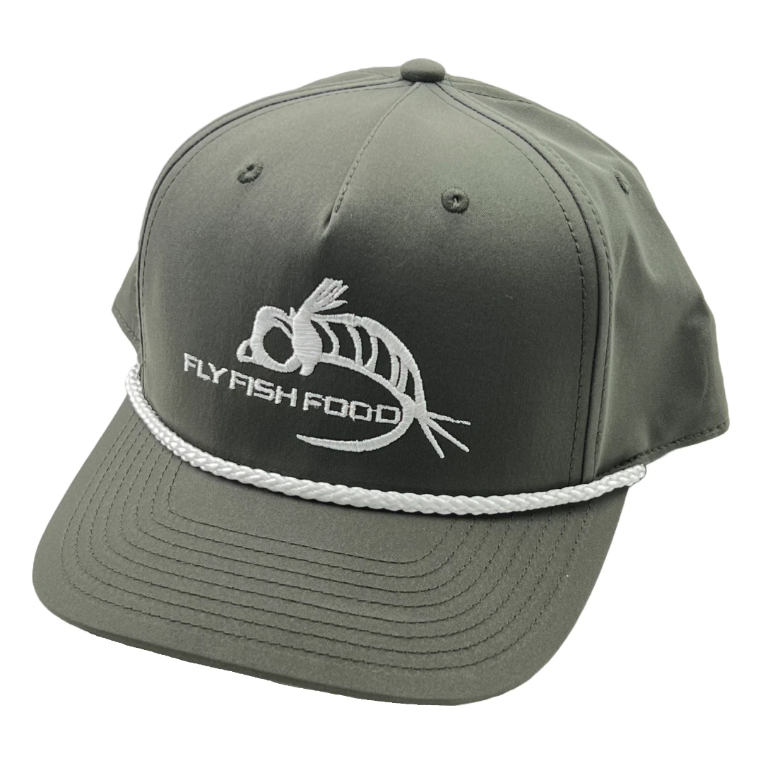 Snap back hat with a simple Fly Fish Food logo. Captain Hat Stye with White Rope